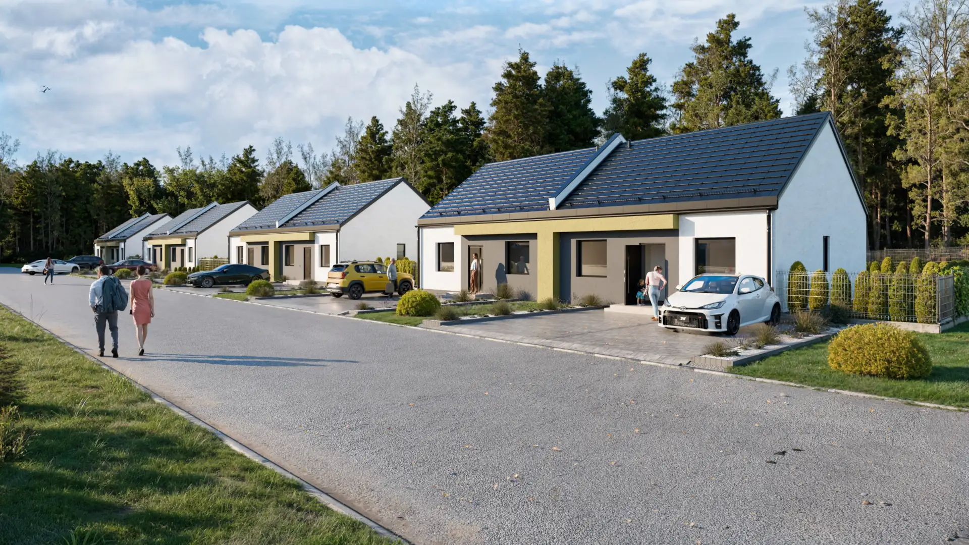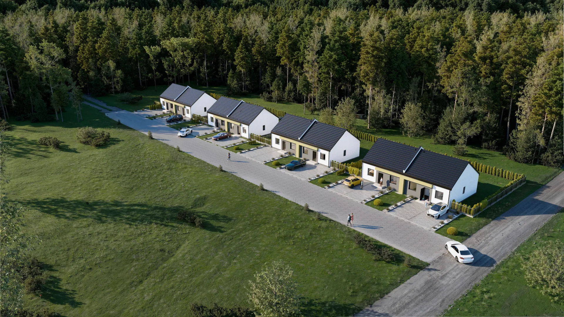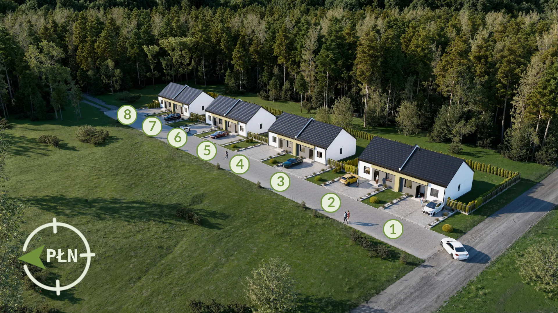 4 budynki typu bliźniak – łącznie 8 lokali mieszkalnych, powierzchnie domów dopasowane do potrzeb rodzin oraz osób ceniących przestrzeń, nowoczesna architektura w spokojnej, zielonej okolicy, każdy lokal z własnym ogródkiem i miejscem postojowym.
